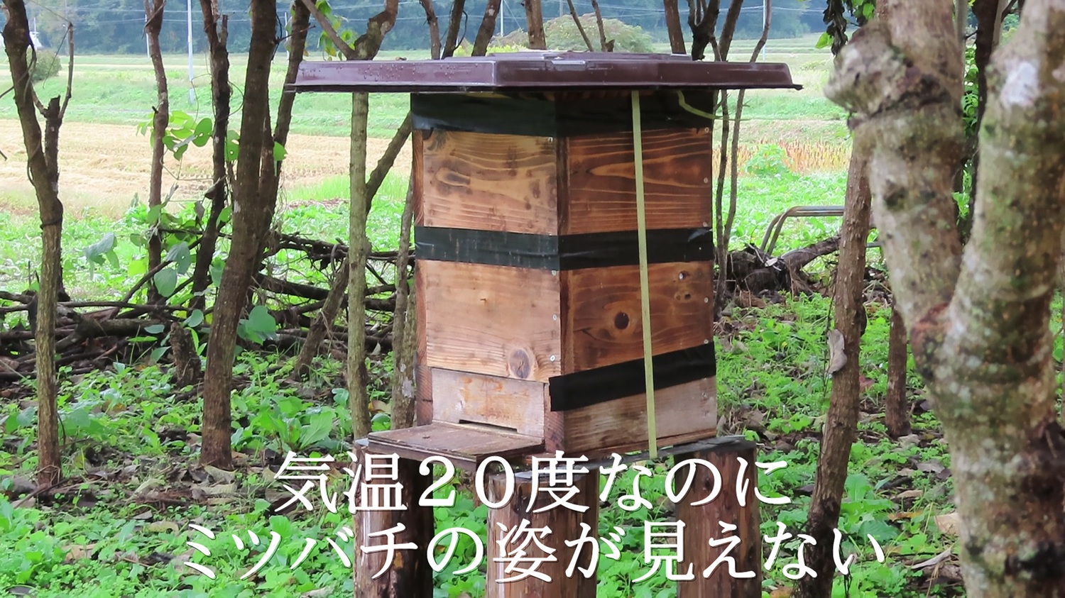 今年は、日本ミツバチの巣箱を4カ所設置したけど、虫一匹入居せず。それを見かねた養蜂家の友人が、巣箱毎畑に持ってきてくれました。