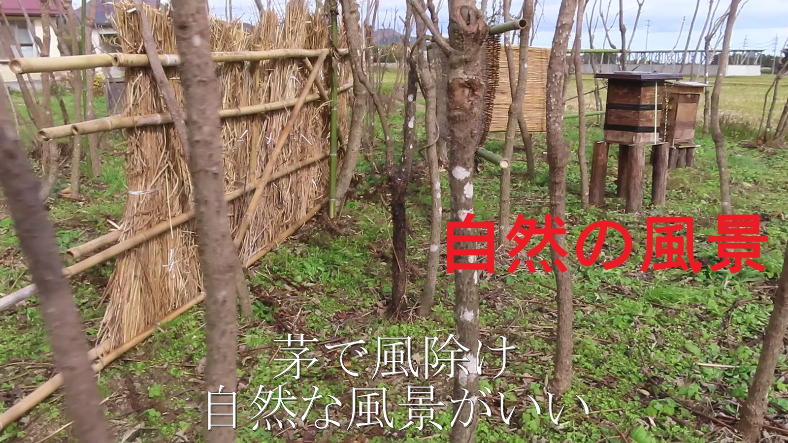 みちのく郡山も、晩秋と共に西からの強風が吹き晒します。奥羽山麓を越えて、諏訪峠の旧坂を巻き上げるのです。数年前には、農場直ぐ近くに県警ヘリがダウンバーストで墜落。初めて冬を迎える分蜂ミツバチ。何とか守りたいと、茅屋根修復で余った茅を利用して、暴風楯を作成しました。