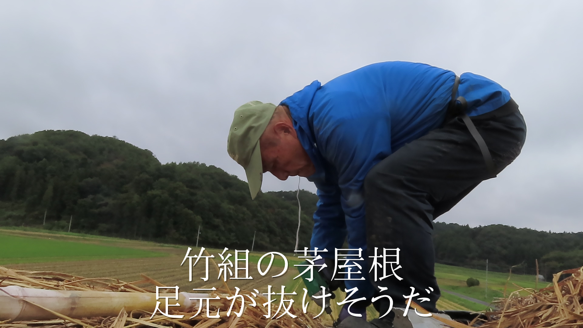 畑小屋 べランダの茅葺き屋根を修復工事  山ブドウでワイン風味