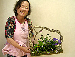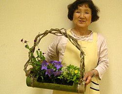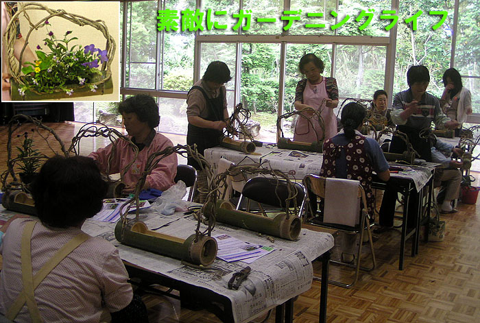 <郡山市三穂田公民館主催ガーデニング>◇公民館主催によるカルチャー教室には、いろんな趣味教室が開催されています。私が受け持つ教室には、日帰りで登山を楽しむトレッキング教室。俳句。絵手紙。カヌーツーリング教室。ログハウス。カラオケ教室。蕎麦打ち教室。豆腐造り教室。ソーセージつくり教室。そしてガーデニング教室があります。 今回は、郡山市西部に広がる三穂田地区。三穂田公民館にお邪魔しました。この教室では、野山から採取しておいたアケビや藤のツル等を編みこみながら「竹コンテナガーデン」を造ります。 市販の素材と違い、同じパーツは何処にもありません。みなさん、思い思いに創作を楽しみました。 |
