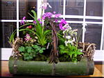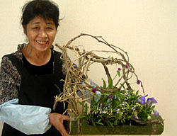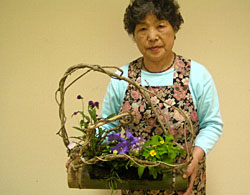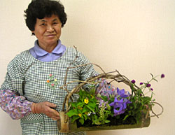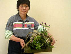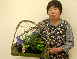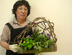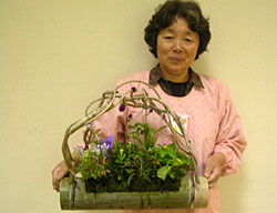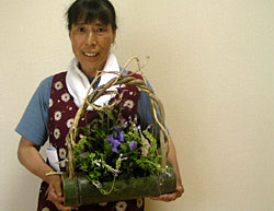 ●材料調達。ヤマフジ。アケビの蔓などは前もって準備(冬の間)しておきました。 先ずは竹素材の選び方。如何にカットするか。その取っ手の曲がり具合を見て、いかにアレンジメントするか。いろんな創作プランがありますので、各自決定していただきます。 竹素材には、自然な蔓がよく似合います。此処が「侘び寂び」ポイントの分かれ目なのです。 ツル素材を絡ませながら、お気に入りの持ち手を造り上げます。 ●コンテナとなる竹は、真竹の太いものをカットして利用します。 この作業は、ノコやノミを使用して造型しますので、女性にはチョッと無理かもしれません!時間に制約がある教室の場合は、前もって仕上げたものを使います。竹以外にも、木の根や瓦。ザル編み。木枠。陶芸等で仕損じたもの?を使うときもあります。ようするに、自然のままの器が似合いますからね。 草花の根本には、苔やシダで被います。こうする事によって、保水能力が増すばかりではなく、見る方の心に潤いと安らぎを与えてくれます。 |