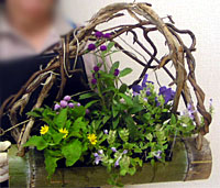 ●野草などは、季節に応じたものを使用いたします。今回は初夏の季節でしたので、野草が少なく市販の草花を用意しました。 ご自宅の玄関先に置く場合。又は窓辺などに置かれる場合には、遠めになる方に背丈の高いものを植え込みます。 ![]() 竹コンテナは、植え込みスペースが限られていますので、用土で覆うよりもコケ類でカバーした方が水持ち良くなります。植え込みのポイントは、ギシギシに詰め込まないことです。空気が通うぐらいにして、苔をしっかりと廻しこみます。 ●前もって竹の左右には、持ち手を通す穴を開けておきました。太さを見ながら、中まで差し込みますと抜けなくなります。細い蔓は、二本ひねりを加えてから差し込むと丈夫です。 ●寄せ植えのアドバイス コンテナスペースは広くないので、背景となる株は背丈の高いもの。 フロントは蔓アーチの半分以内。そして竹の淵周りにはアンダーフラワーを配置します。 |