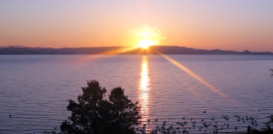 「心に残る湖畔の夕陽」■夕陽は、朝日とは異なり「心の封鎖」「事の閉め」などの、ネガティブなイメージと思われがちです。しかし、夕陽には、身に余る「心の高ぶり」や我が身の「思い上がり」。幸喜した心を鎮めてくれる「心療効果」もあるのです。 猪苗代湖は山上湖でも、西側には奥羽山脈がありますので、湖上の朝陽は時既に遅しの感があります。もちろん、一六橋方面からは山上からの朝陽と湖面の輝きはご覧いただけます。 右の写真は、晩秋時の夕陽です。天候の加減から、湖面にフレアする時。上空にフレアする場合がある。このような時には、明日は雨の日が多くなる。 湖畔の宿で働く私には、いつも見ているせいか特別な感情はなかったのですが、日毎に移り変わる季節感が、落日の位置が知らせてくれます。 黄昏ゆく夕陽。湖畔の宿は、湖から約20mしか離れておりません。 足元まで迫る光を跨ぎながら?シャッターを切る。これは快感です! |