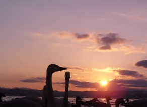 ![]() <カモと夕陽> ■猪苗代湖には、晩秋から数万羽という渡り鳥がやってきます。 一番多いのは、やっぱりカモ達です。11月になると、シベリアから白鳥もやってきます。数が増える頃には、磐梯山が雪化粧しています。中には、傷ついてシベリアに帰れなかった白鳥もいます。白鳥物語。 真冬の湖岸帯は、波の音と吹きすさぶ風の音だけです。 野鳥たちは多様達は、人が近づいても飛び立つことはありません。この時期だからこそ、自然が身近に感じられます。一人旅。夫婦旅。人其々が、心に残してほしい夕陽です。 |