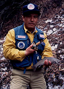 わか菜ちゃんにばかり釣られては、私の面目 まる潰れだ。一発逆転を狙って、倒木が沈む 危険地帯に突入。是が相して、大きなアタリが ロッドをしならせた。デカイ!!! 永年の感で、湖底に突き刺す弾き方でイワナ と判断。エンジンをスローダウンして慎重にラ ンディング。何と、50cmオーバーのイワナだ った。内心ほっとしました。 イワナは、身を隠す場所が無いと居着かない性 質がある。湖面からでは底の判断が難しいの で、周辺の地形をよく見てコース取りしましょう。 |